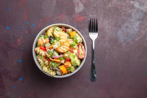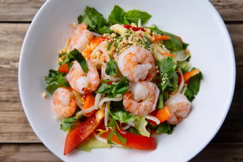 Lettuce with shrimps, almonds, spices, herbs, onions, bell peppers, tomatoes, cucumbers, and onions. Be sure...