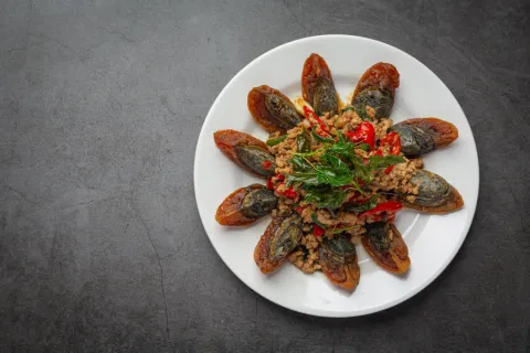 Tender conch with cashew, spices, herbs, onions, and tomato sauce. Be sure to purchase utensils...