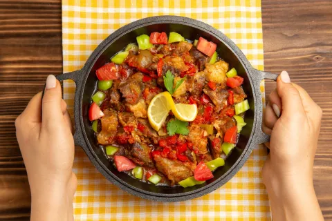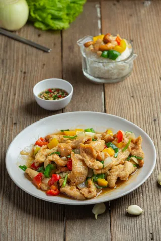 Flash fried chicken with spices, herbs, onions, and tomato sauce. Be sure to purchase utensils...