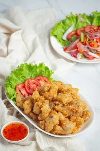 Regular chicken with spices, and flash fried. Be sure to purchase utensils if you'll need...
