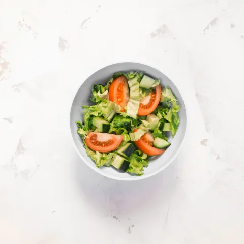 Romain lettuce, tomatoes, cucumber, and onion. Be sure to purchase utensils if you'll need them...