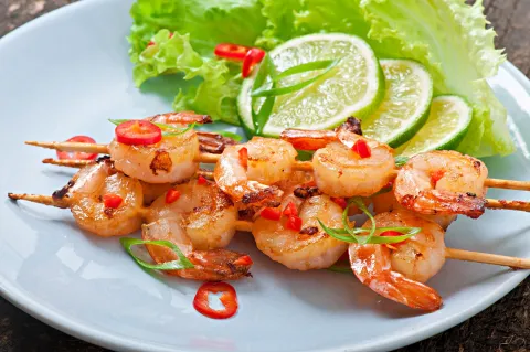 Almond, shrimp, spices, herbs, onion, bell peppers, lettuce, tomato, cucumber, and onion. Be sure to...